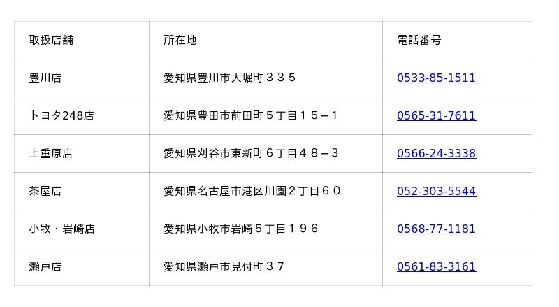 デモ車両常設展示店舗の所在地および電話番号: