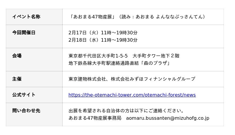 東京建物株式会社東京建物株式会社と株式会社みずほフィナンシャルグループは、地域創生に向けた取り組みの一環として、日本全国の名産品を集めた「あおまる47物産展」(以下「本物産展」)を大手町タワー(東京都千代田区)内の「森のプラザ」で、2025年1月より定期開催しています。