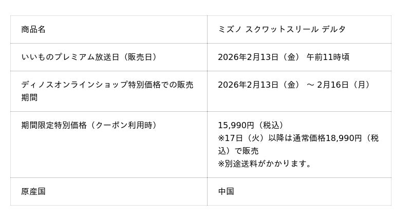 株式会社dinos(本社:東京都中野区、代表取締役社長:加藤 浩輔)は、座りながらトレーニングができるスクワットチェアの最新モデル「ミズノ スクワットスリール デルタ」を企画し、dinos限定で発売します。本商品は2026年4月に創業120周年を迎える総合スポーツ用品メーカーのミズノ株式会社(本社:大阪市住之江区、代表取締役社長:水野 明人)と、同年12月に創業55周年を迎えるdinosが、周年記念商品として企画・開発しました。なお、販売記念として、2月13日(金)放送のフジテレビ番組『ノンストップ!』の通販コーナー『いいものプレミアム』で放映。2月16日(月)まで期間限定特別価格で販売いたします。