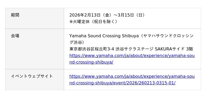 ヤマハ株式会社期間:2026年2月13日(金)~3月15日(日)、会場:Yamaha Sound Crossing Shibuya(ヤマハサウンドクロッシング渋谷)