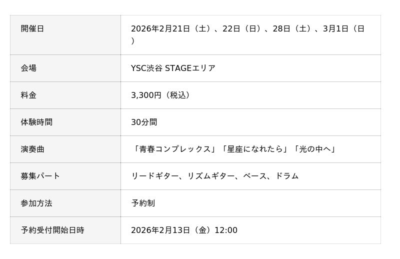 YSC渋谷のスタッフ2名(ドラム、リードギターまたはリズムギター)と一緒にバンドを結成し、「結束バンド」の楽曲をステージで演奏できます。