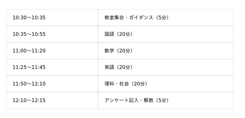 105分(国語・数学・英語各20分、理科・社会計20分、ガイダンス・休憩等25分)