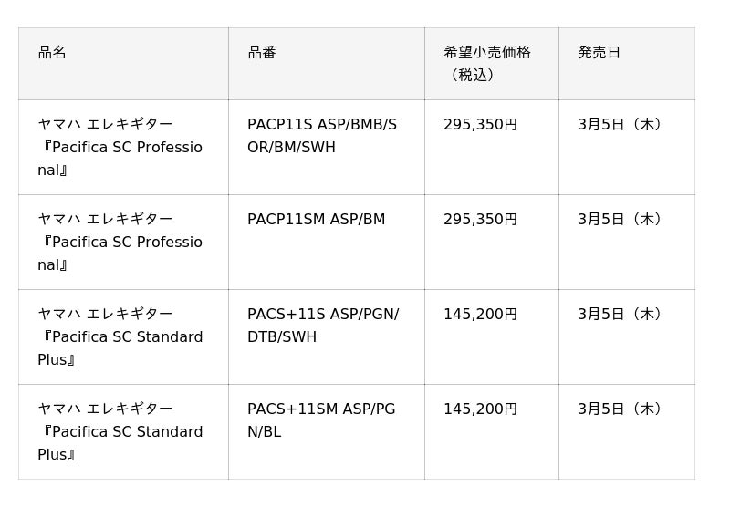 ヤマハ株式会社(以下、当社)は、エレキギターの新製品として『Pacifica SC Professional』『Pacifica SC Standard Plus』を2026年3月5日(木)に発売します。