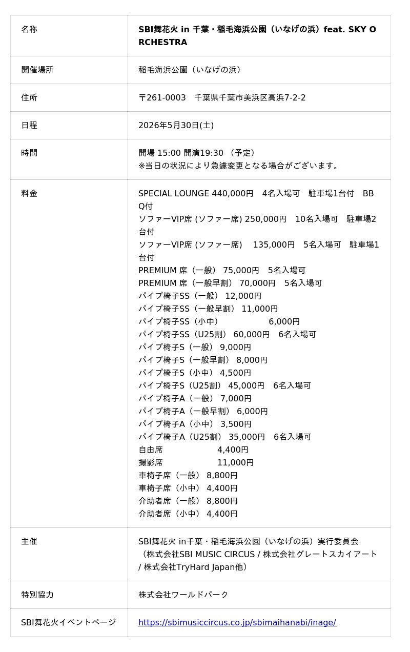 株式会社SBI MUSIC CIRCUS株式会社SBI MUSIC CIRCUS(本社:東京都港区、代表取締役社長:大付楽洋、以下 当社)は、2026年5月30日(土)、千葉県・稲毛海浜公園(いなげの浜)にて、「SBI舞花火 in 千葉・稲毛海浜公園(いなげの浜)feat. SKY ORCHESTRA」を開催いたします。本公演はSBI舞花火としていなげの浜で初開催となる花火大会です。