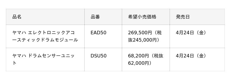 ヤマハ株式会社(以下、当社)は、エレクトロニックアコースティックドラムモジュールの新製品として、『EAD50』を4月24日(金)に発売します。また、『EAD50』に付属するドラムセンサーユニットを単体製品『DSU50』として同時発売します。