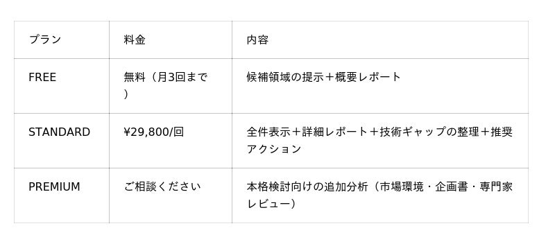 なお、本サービスは採用や成果を保証するものではなく、宇宙参入を検討する際の候補領域の絞り込みや、参入に向けた仮説の構築を支援することを目的としています。