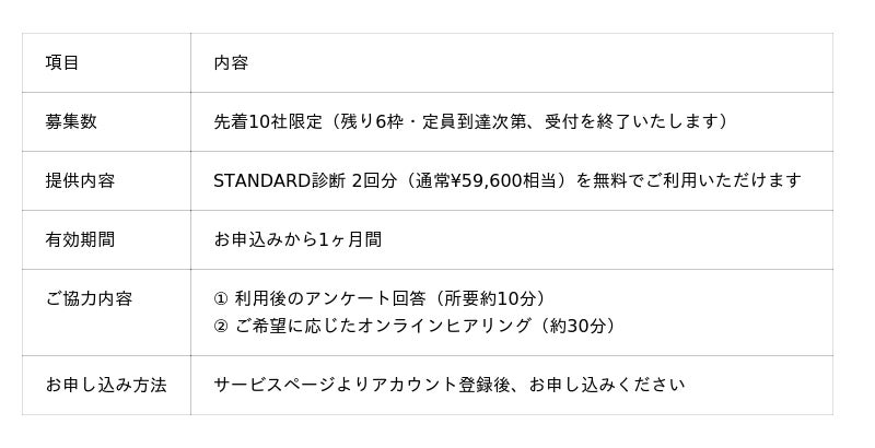 サービスの改善に向けたアンケートやヒアリングにご協力いただける企業様を「共創パートナー」として募集いたします。共創パートナーにお申し込みいただいた企業様には、STANDARD診断(通常¥29,800/回)を2回分無料でご利用いただけます。