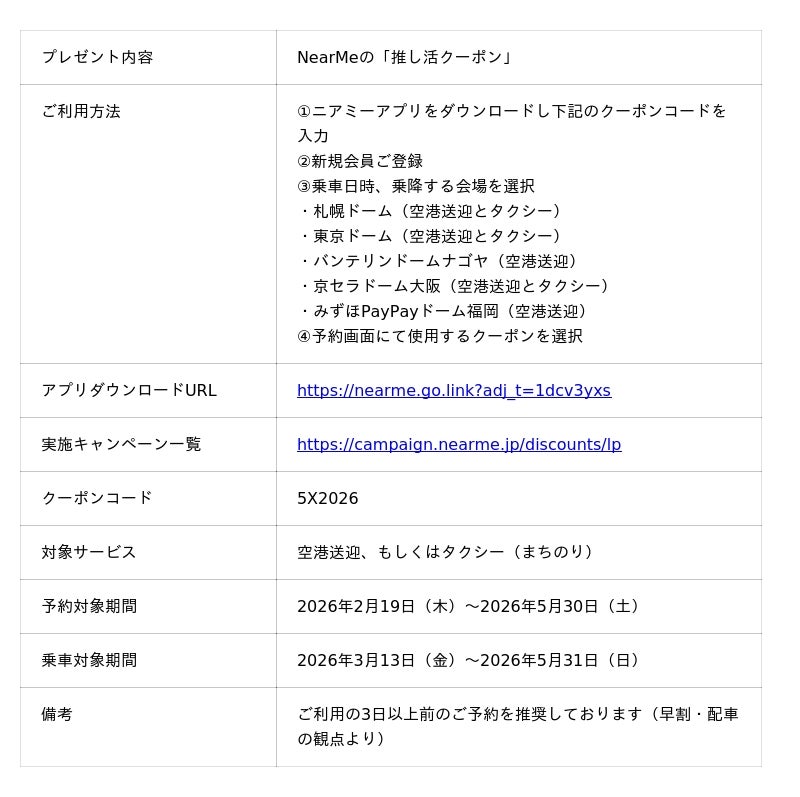 移動の課題に取り組むソーシャルデザインカンパニーの株式会社NearMe(本社:東京都中央区、代表取締役社長:高原幸一郎、以下:ニアミー)は、ライブやスポーツ観戦など、推しに会いに行く「推し活」の一日の移動を快適なものにするため、2026年2月19日(木)より、「推し活」の際にニアミーをより気軽に利用できる、期間限定のおトクなクーポンをプレゼントいたします。
