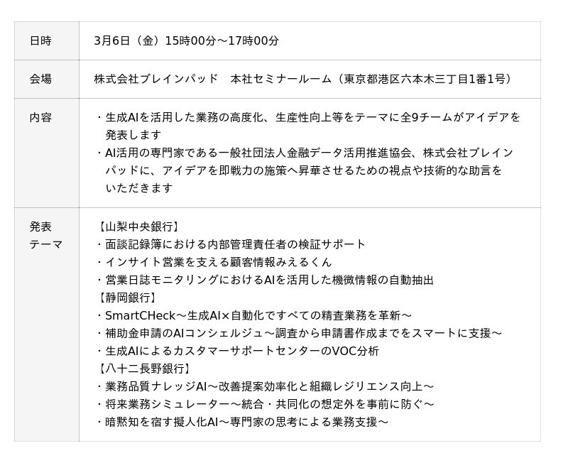 ・本発表会を機に、各行が取り組む生成AI活用の知見共有や、活用のアイデアの実装に向けた連携をさらに推進します。