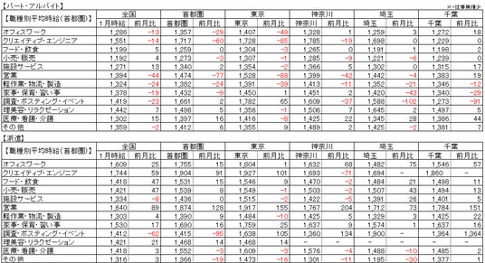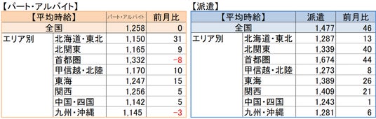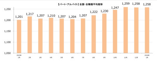 【パート・アルバイト】全国・全職種平均時給は1,258円。前月比±0円。前年同月比+57円。
