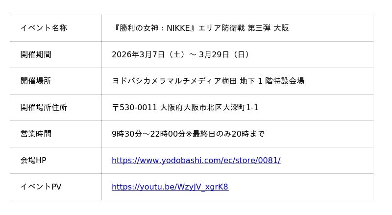 株式会社アルジャーノンプロダクト(本社:東京都台東区)は、2026年3月7日(土)からヨドバシカメラマルチメディア梅田 地下1階特設会場(以下:POP UP会場)にて全国6都市を巡るPOP UPイベント「『勝利の女神:NIKKE』エリア防衛戦 第三弾」を実施することを発表いたしました。