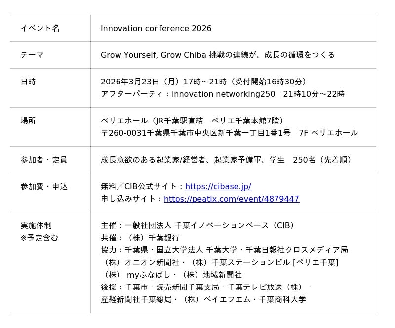 一般社団法人千葉イノベーションベース~Grow Yourself, Grow Chiba 挑戦の連続が、成長の循環をつくる~<2026年3月23日(月)17時~21時 ペリエホール>