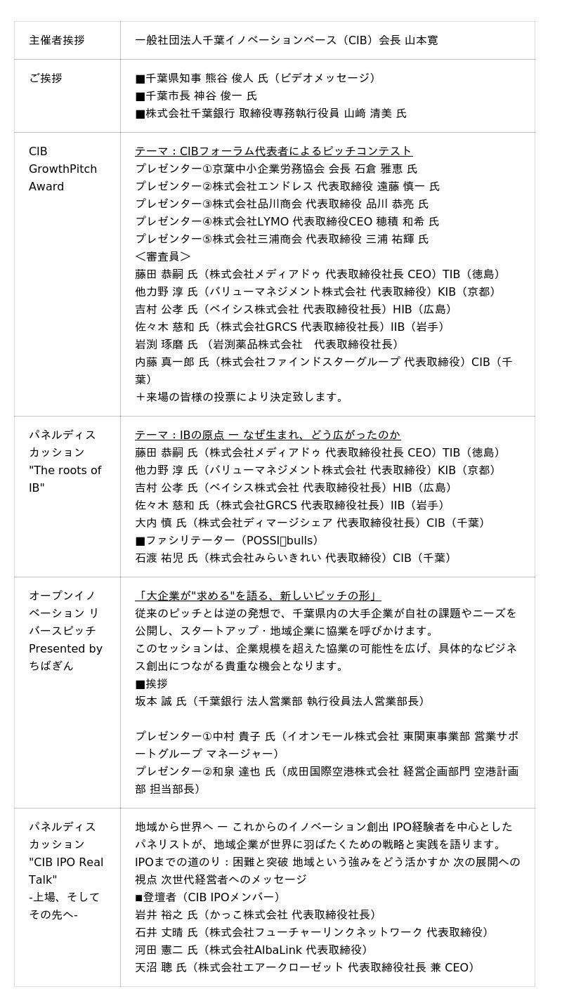 また、第4回目となる今回は、「Grow Yourself, Grow Chiba 挑戦の連続が、成長の循環をつくる」をテーマに、全国に広がるIBがどのように生まれ発展していったのか?パネルディスカッション "The roots of IB"や、地域から世界へ 、CIBメンバーでIPO経験者を中心としたパネリストが、地域企業が世界に羽ばたくための戦略と実践を語ります。また、新たな取り組みとして、県内を代表する大企業より、オープンイノベーション リバースピッチ 「大企業が"求める"を語る、新しいピッチの形」を実施。 従来のピッチとは逆の発想で、千葉県内の大手企業が自社の課題やニーズを公開し、スタートアップ・地域企業に協業を呼びかけます。