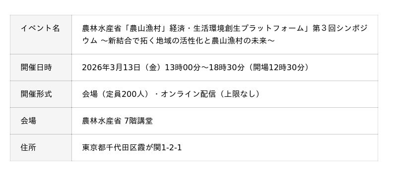【プログラム詳細・登壇者決定】農林水産省「農山漁村」経済・生活環境創生プラットフォーム第3回シンポジウム~3月13日(金)13時から農林水産省講堂&オンラインでハイブリッド無料開催~
