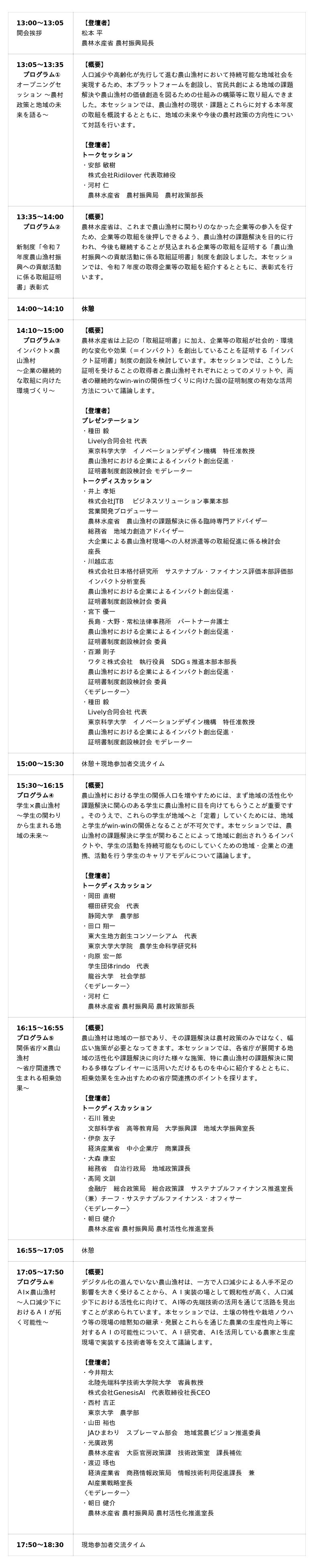今回で3回目の開催となる本シンポジウムでは、令和7年度に実施した官民共創による地域の課題解決や農山漁村の価値創造を図るための取組について、取り組みに関わった多様なプレイヤーが登壇する6つのプログラムを実施。取り組みの成果や今後の課題を共有するとともに、官民共創をさらに進めていくため、新たな分野との「新結合」による取組事例の紹介やディスカッションを行います。