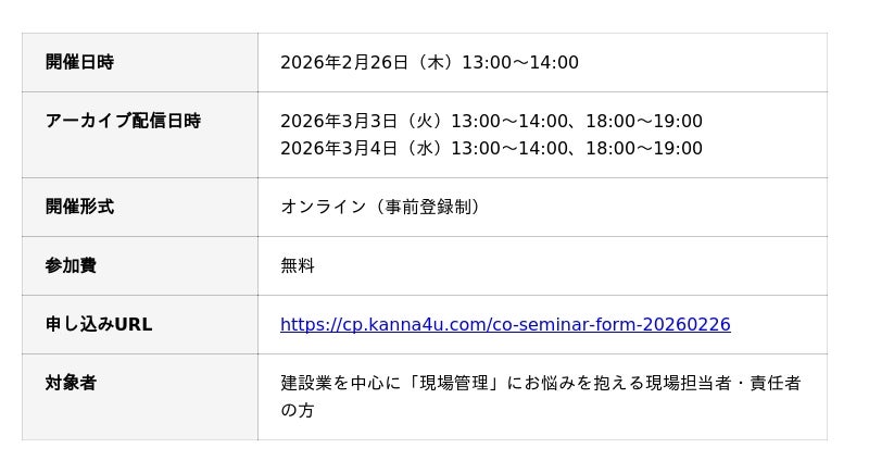 株式会社アルダグラム株式会社アルダグラム(本社:東京都港区、代表取締役:長濱光、以下「アルダグラム」)が提供する現場DXサービス「KANNA(カンナ)」は、Paintnote株式会社(本社:品川区、代表者:藤井友輝、以下「Paintnote」)と共催で、2026年2月26日(木)に現場管理にお悩みを抱える現場担当者・責任者の方を対象とした「現場責任者のための「段取り」効率化戦略」をテーマとしたオンラインセミナーを開催します。本セミナーでは、なぜツールを導入しても課題がなくならないのか、その"本当のボトルネック"を、両社の視点から構造的に解説します。
