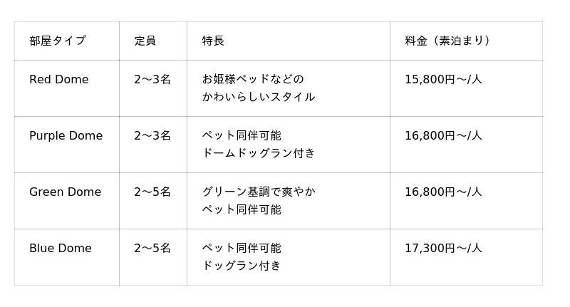 ワンちゃんと一緒に泊まれるドームもご用意しておりますので、愛するペットと共にやすらぎのひと時をお過ごしください。