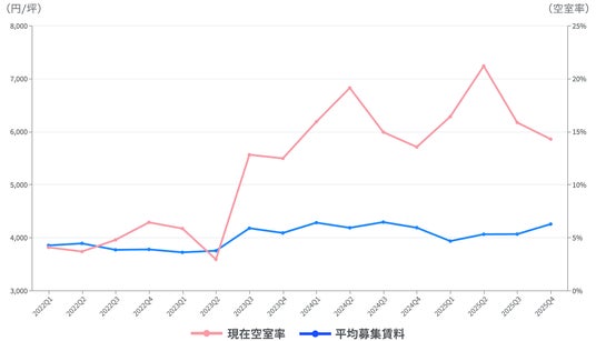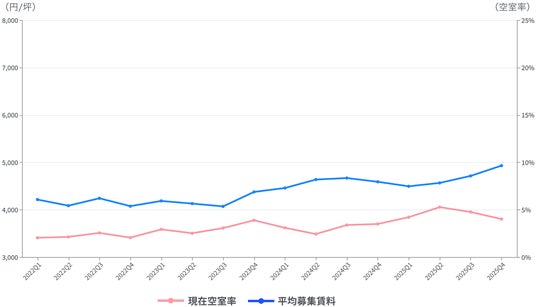 近畿エリアでは2025Q3, Q4と空室率が下降トレンドであるが、募集賃料は2025Q2から上昇トレンドとなっている。