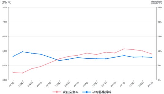 首都圏エリアの空室率・募集賃料推移:空室率は2025Q3, Q4で下降しているが、募集賃料についてはほぼ横ばいで推移しており、