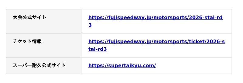 チケットの詳細はチケットサイト(https://fujispeedway.jp/motorsports/ticket/2026-stai-rd3)をご確認ください。