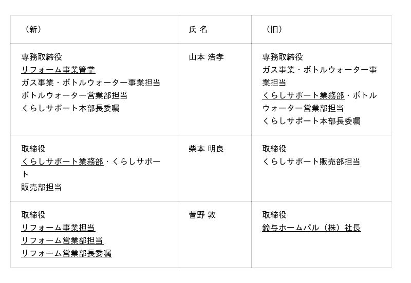 リフォーム事業を展開してきた子会社の鈴与ホームパル株式会社より事業譲渡を受け、リフォーム事業を担う専門組織として、リフォーム営業部を設置致します。人事異動について2026年3月1日付 役員の体制変更 ※下線部が変更箇所となります。
