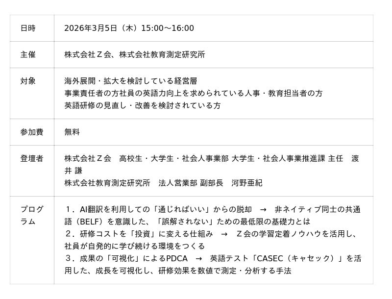 株式会社増進会ホールディングス(Z会グループ)のグループ会社である株式会社Z会(本社:静岡県三島市、代表取締役社長:藤井孝昭、以下「Z会」)は、株式会社EduLab(エデュラボ 本社:東京都港区、代表取締役社長兼CEO:廣實 学)のグループ会社である株式会社教育測定研究所(代表取締役社長:西田 紀子、以下「教育測定研究所」)と2026年3月5日(木)15:00~16:00に、共催ウェビナー『AI翻訳があれば、英語力はいらない?― 社員が自走する英語研修の設計とは ―』を開催いたします。