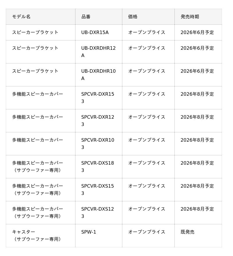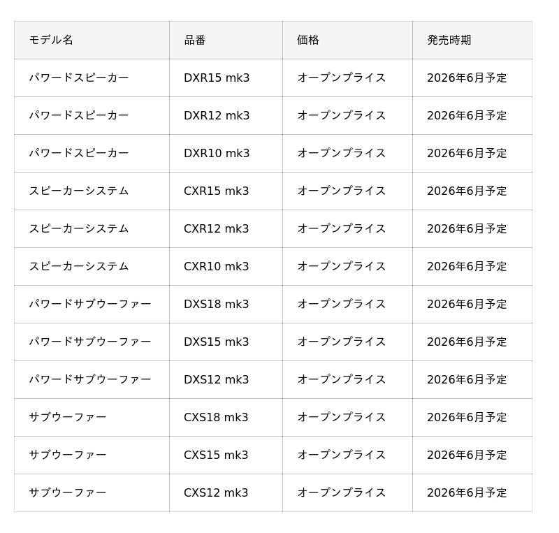ヤマハ株式会社(以下、当社)は、プロフェッショナルオーディオ機器の新製品として、ライブやイベントなど幅広い用途や規模で使えるパワードスピーカー『DXR mk3シリーズ』とパワードサブウーファー『DXS mk3シリーズ』、およびパッシブモデルのスピーカーシステム『CXR mk3シリーズ』とサブウーファー『CXS mk3シリーズ』を2026年6月に発売します。