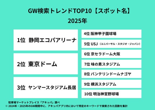 2025年の検索データを見てみると、2024年の検索データでは前年圏外だった「静岡エコパアリーナ」が第1位という結果になりました。同施設ではGW期間中にアーティストの全国ツアー公演などの大型イベントが開催されていました。エコパアリーナは最寄り駅から距離があるため、車での来場を希望する人が多かったことが伺えます。