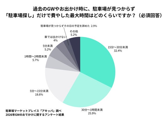 続いて、過去のGWやお出かけ時に、駐車場が見つからず「駐車場探し」だけで費やした最大時間を聞いたところ、6割以上の人が15分以上費やした経験があると回答しています。