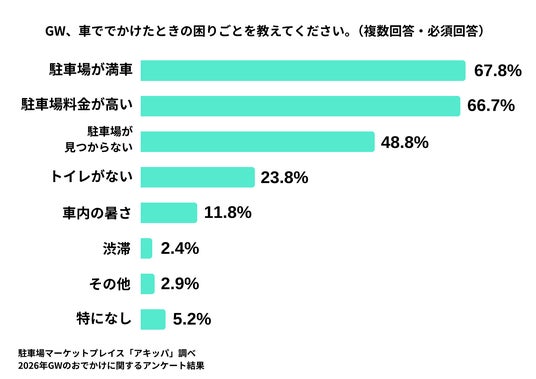 続いて、GWに車ででかけたときの困りごとを聞いてみたところ、「駐車場が満車」(67.8%)が最多という結果になりました。続いて「駐車場料金が高い」(66.7%)、「駐車場が見つからない」(48.8%)が挙げられており、多くの人が車でのおでかけの際に、駐車場に関する困りごとを経験していることがわかりました。