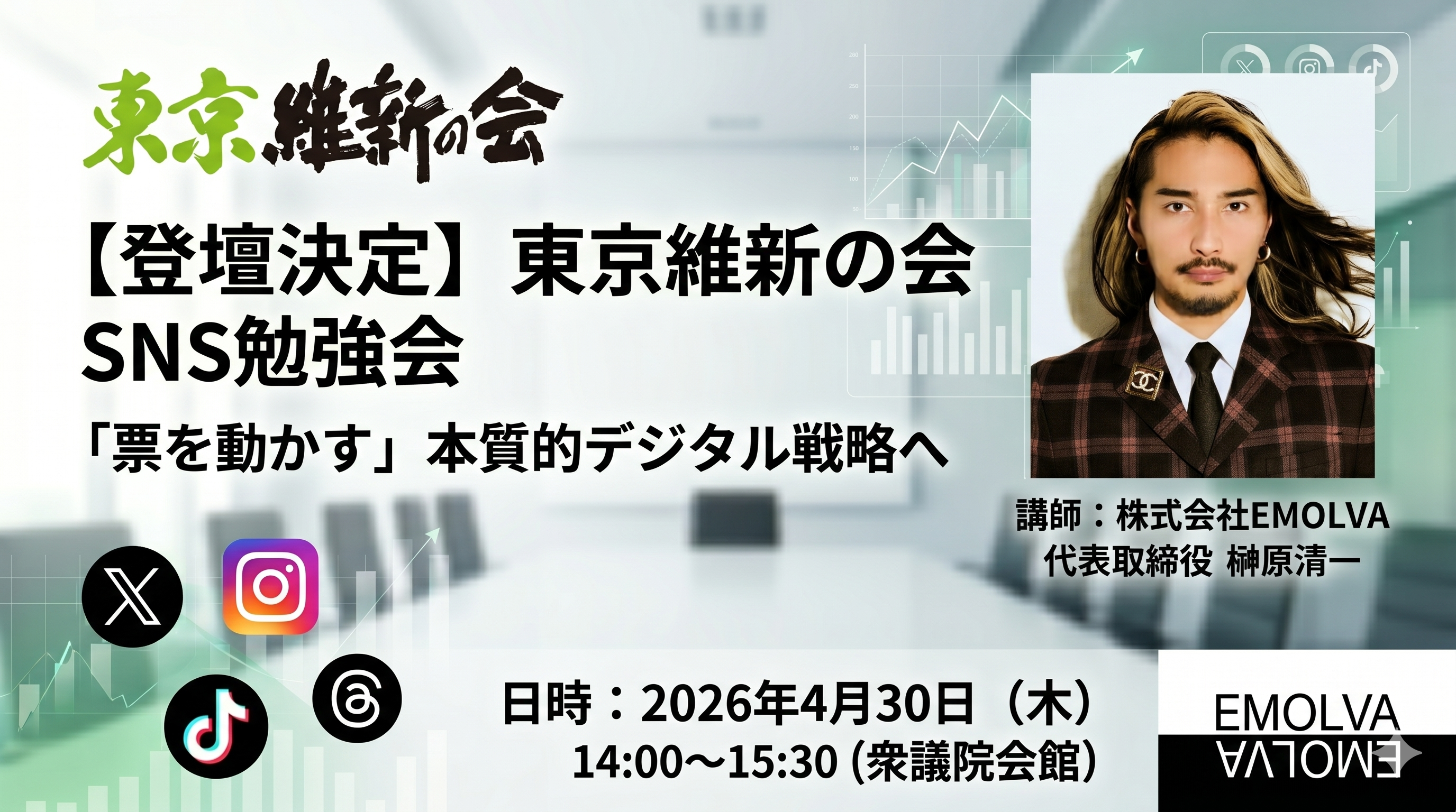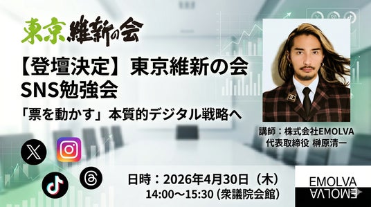 SNSマーケティング事業を展開する株式会社EMOLVA(本社:東京都渋谷区、代表取締役:榊󠄀原清一)は、2026年4月30日(木)、衆議院会館にて開催される「東京維新の会」主催のSNS勉強会において、代表取締役の榊󠄀原清一が講師として登壇することをお知らせいたします。