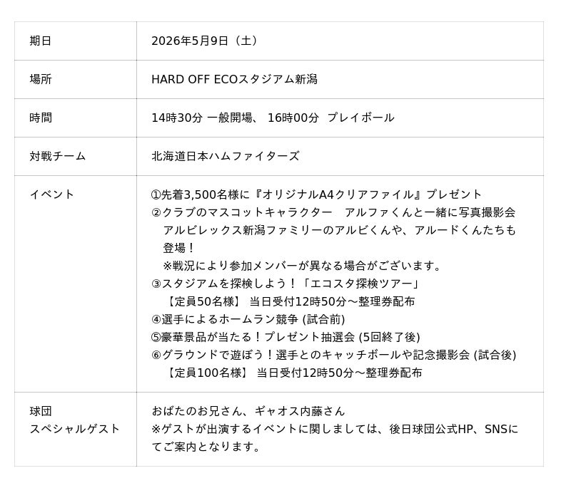 ホームセンターの「コメリパワー」や「コメリハード&グリーン」を通し地域のライフラインであり続けたいと願う株式会社コメリ(所在地:新潟県 新潟市、代表取締役社長:捧 雄一郎)は、2026年5月9日(土)にHARD OFF ECOスタジアム新潟(新潟県新潟市)にて開催される「オイシックス新潟アルビレックスBC 対 北海道日本ハムファイターズ戦」を、「コメリサンクスデー」として開催いたします。