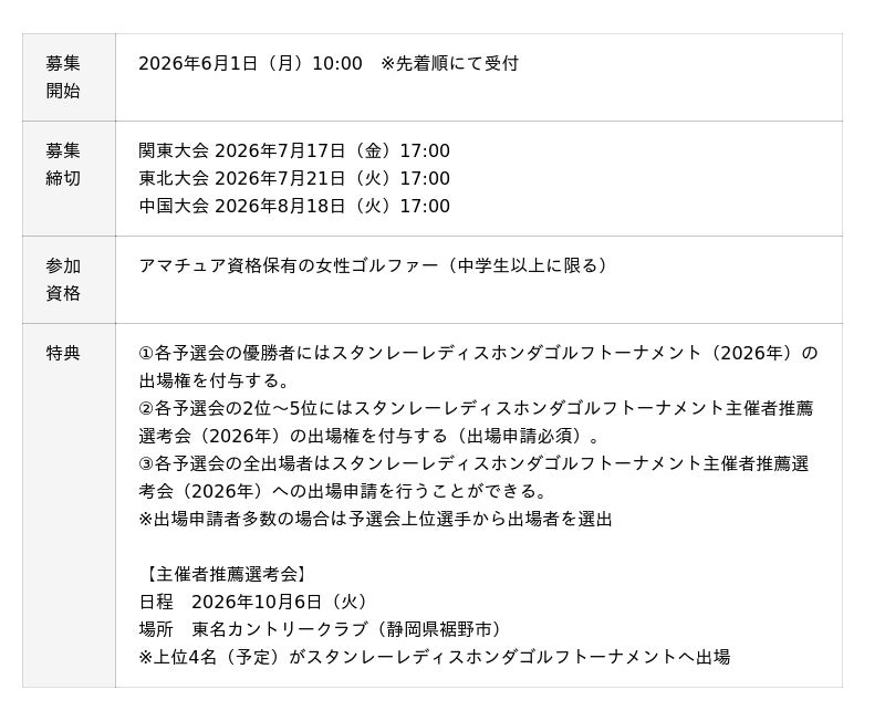 このたびスタンレー電気株式会社(本社 東京都目黒区中目黒 2-9-13、代表取締役 社長執行役員:貝住 泰昭)と本田技研工業株式会社(本社 東京都港区虎ノ門2-2-3、取締役 代表執行役社長:三部 敏宏)は、「スタンレーレディスホンダゴルフトーナメントアマチュア予選会2026」を7月28日(火)、7月31日(金)、8月28日(金)に、それぞれ関東・東北・中国地方で開催します。