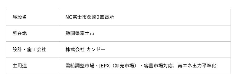 日本蓄電池株式会社(本社:東京都千代田区、代表取締役社長:漆原秀一)は、当社が新たに組成したファンドにて開発を進めているNC富士市桑崎2蓄電所(所在地:静岡県富士市)において系統用蓄電池を設置したことをお知らせいたします。