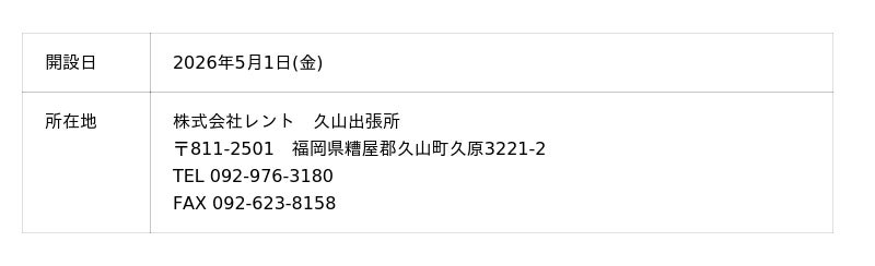 産業機械・建設機械総合レンタル業、株式会社レント(静岡市駿河区、代表取締役:岡田朗)は、福岡エリアにおける営業活動の拡大を目的として、福岡県糟屋郡久山町に「久山出張所」を新設し、2026年5月1日より営業開始の運びとなりましたので、お知らせいたします。