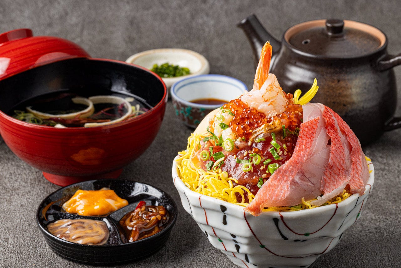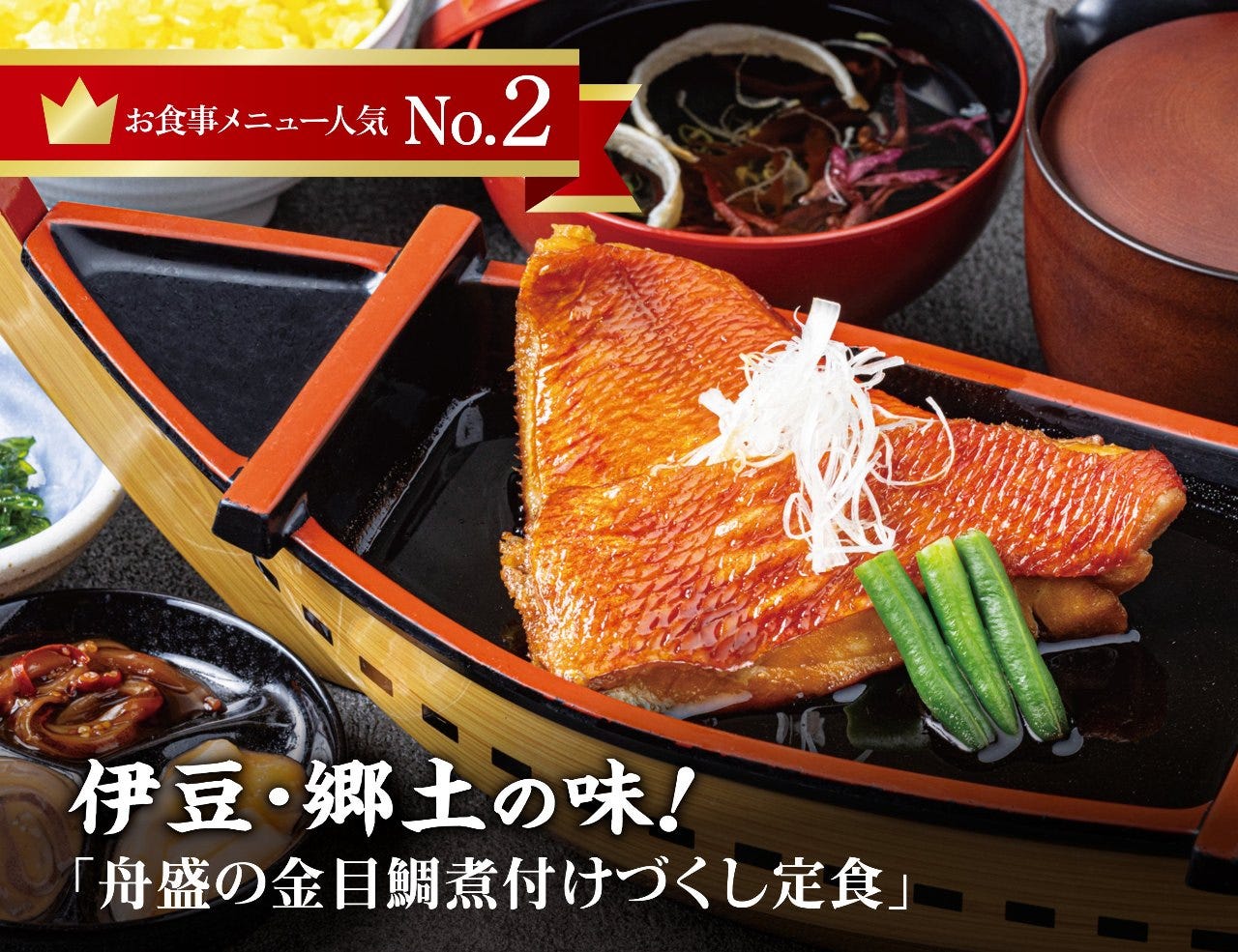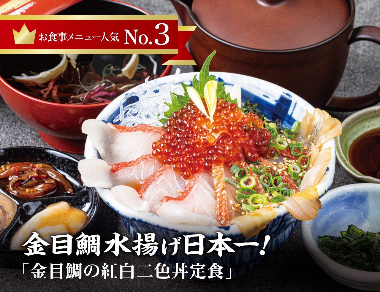 当店の主役は、伊豆稲取の網元である徳造丸が選び抜いた金目鯛。脂がのった肉厚な金目鯛のみを厳選して使用。長年の経験で培われた目利きと漁獲から加工まで一貫して手掛けることで実現できる圧倒的な鮮度と品質が自慢です。脇を固めるイカの塩辛や〆に使うあご(トビウオ)出汁など細部に至るまでこだわり抜いております。