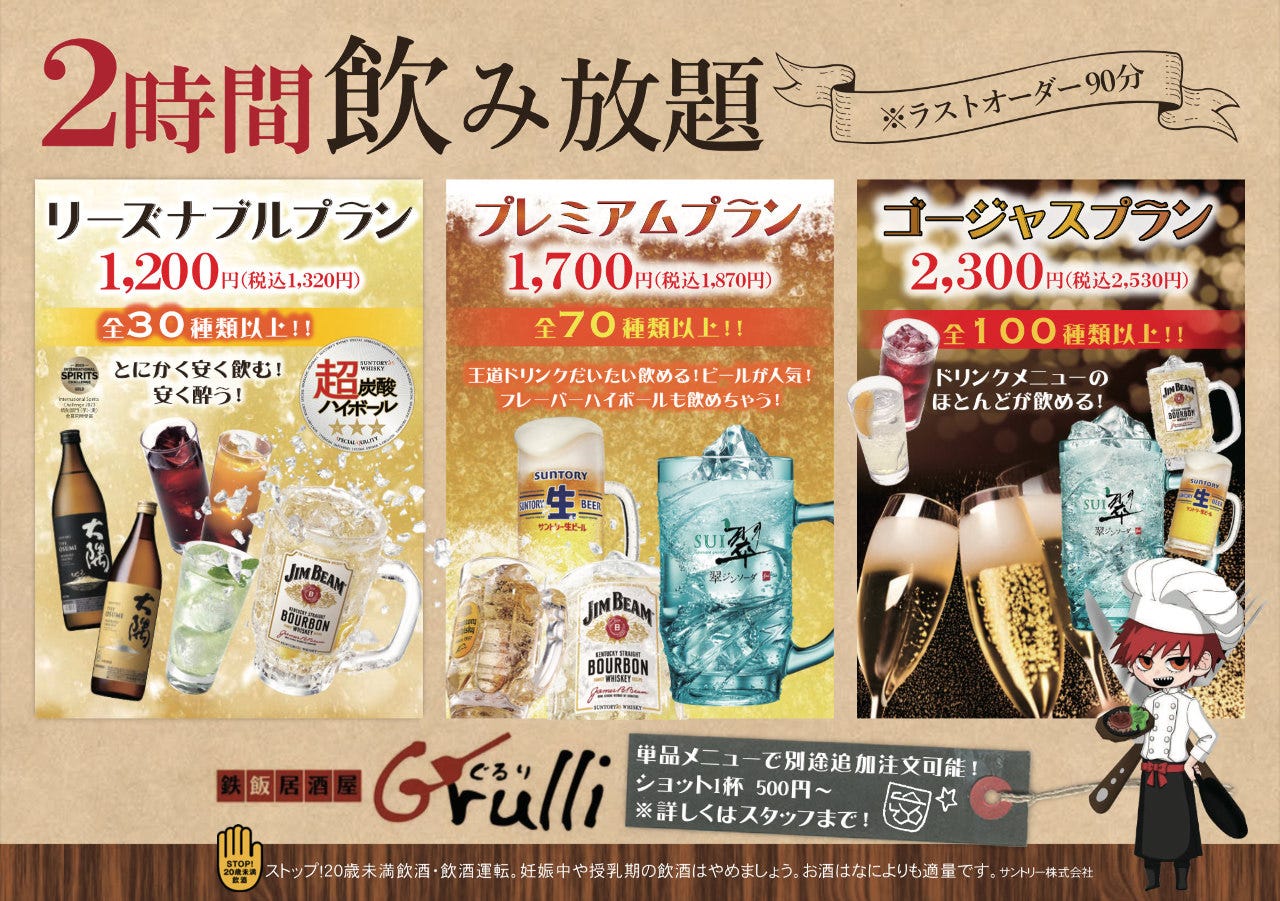 お手頃価格でキャッチーなスタッフが出迎える大衆居酒屋!大人気の牛100%ハンバーグなどの鉄板焼きをはじめ、軽いおつまみ〜がっつりお食事、デザートまで幅広いメニューを揃えてお待ちしております。有楽街の飲み始めからシメまでやっぱりGrulliでキマリ!