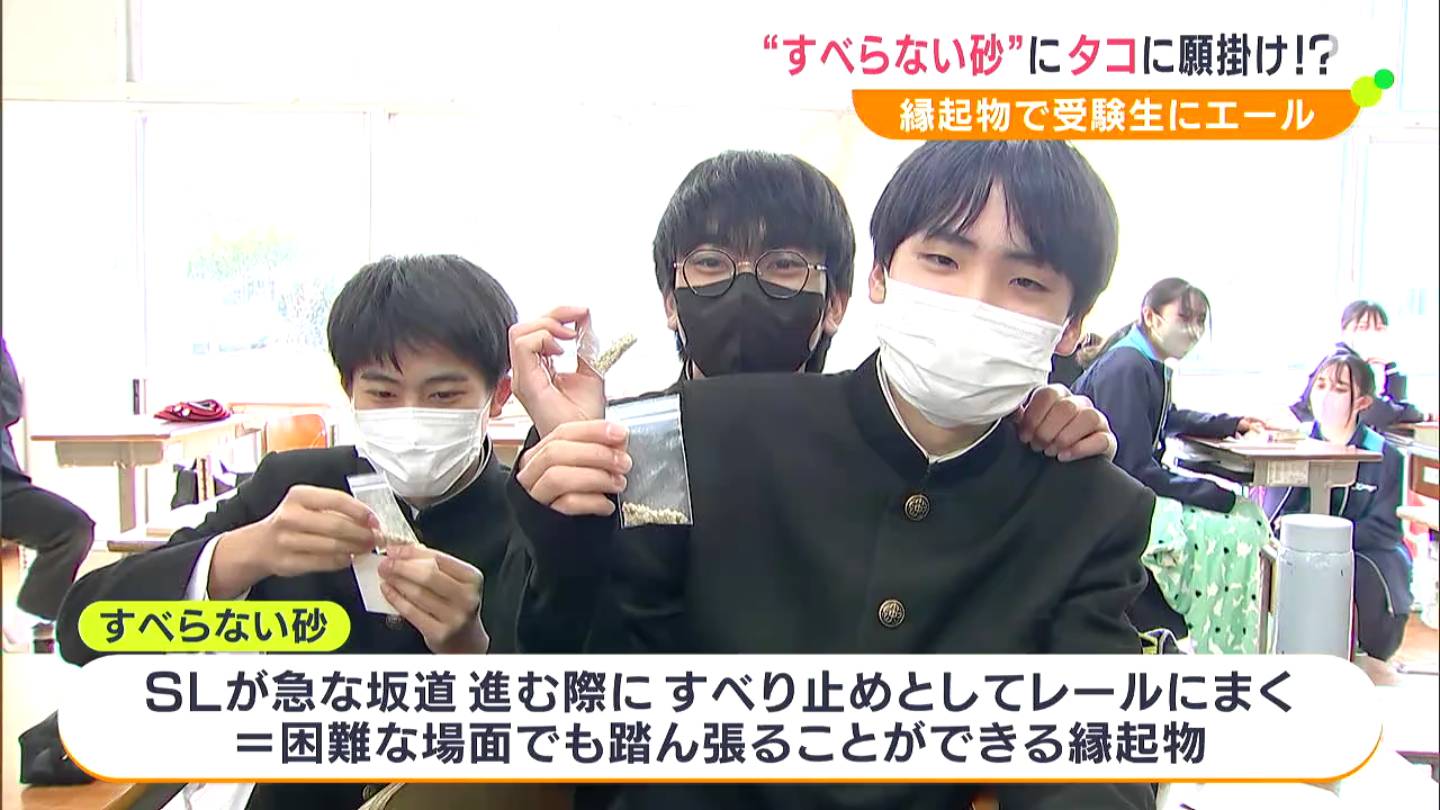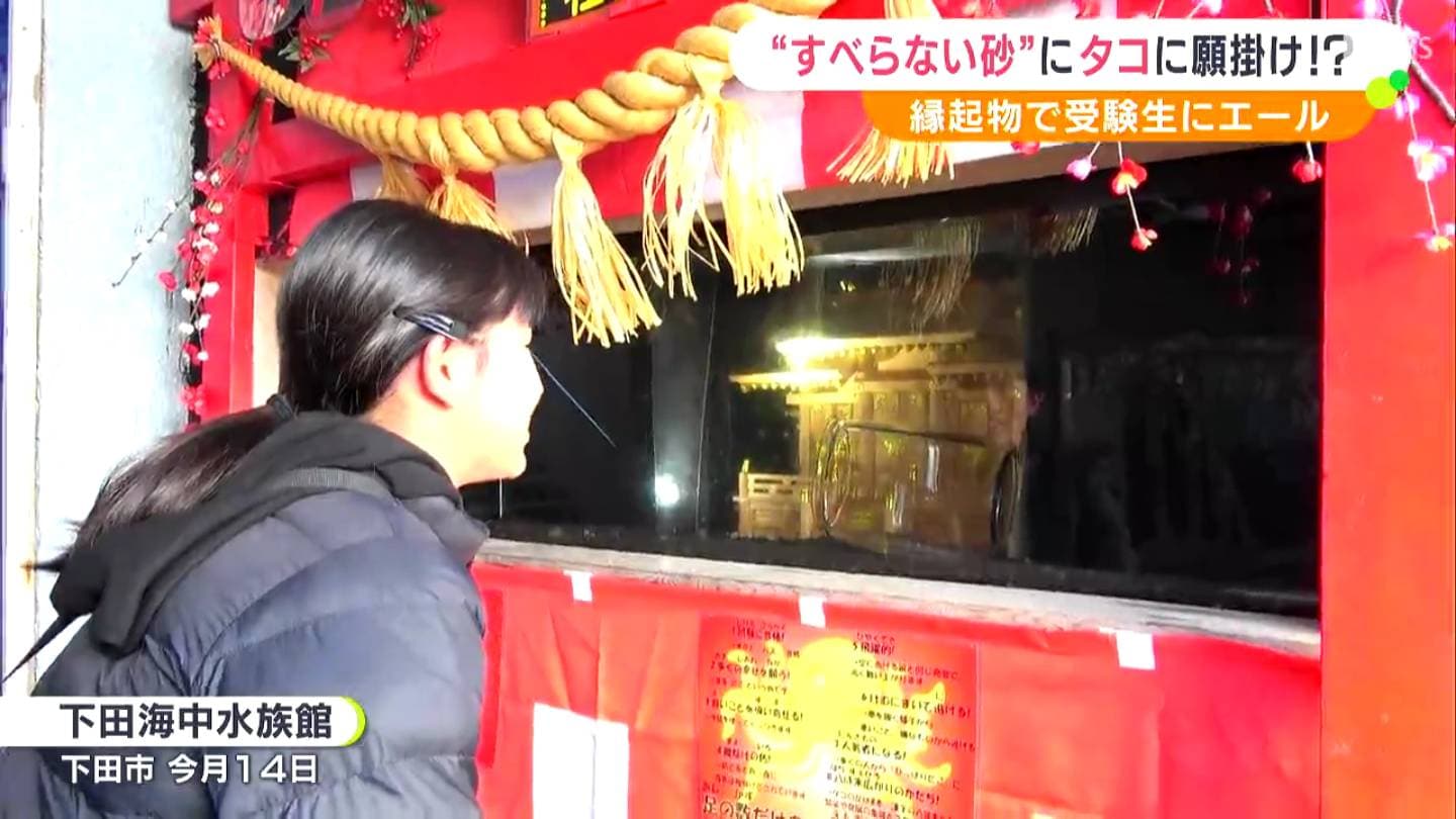 寒さに負けず、頑張る受験生を縁起物で応援。静岡県の大井川鉄道は、沿線の中学3年生に「すべらない砂」を、下田市の水族館ではタコを飾って合格祈願です。