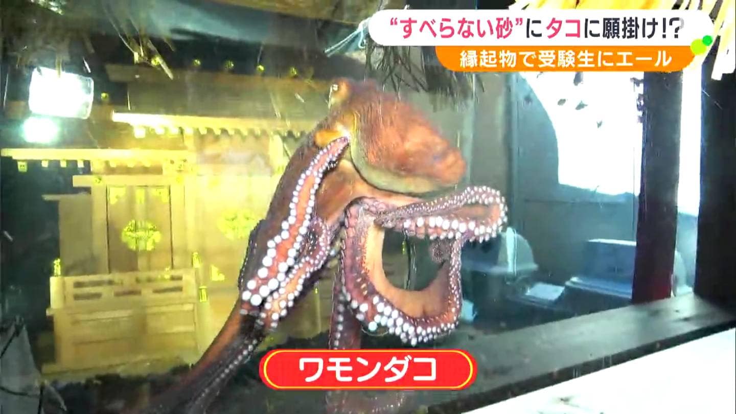 毎年冬の受験シーズンに合格を祈願する水槽を設けていますが2024年はタコを展示。タコは英語で「オクトパス」。「置くと」試験に「パス」できるようにと願いが込められています。