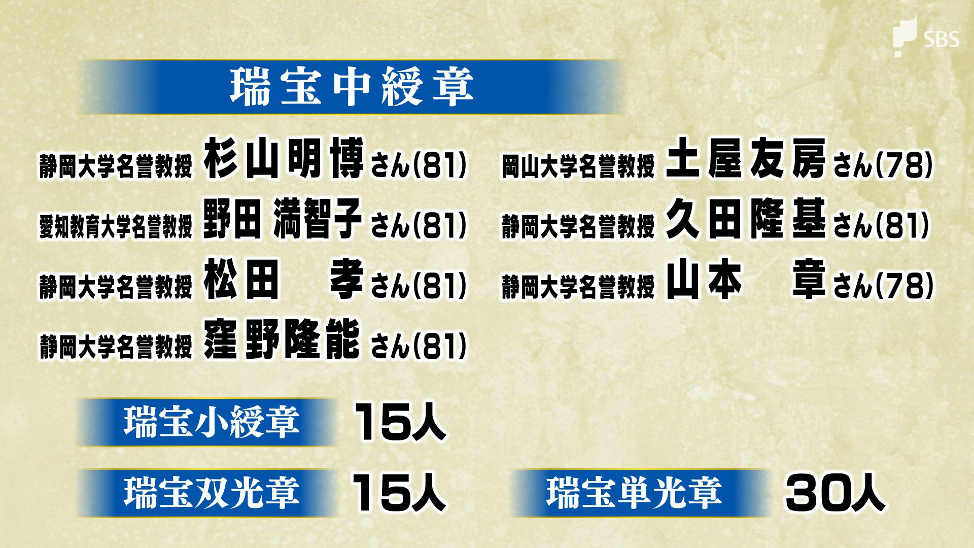 公の仕事に長年従事してきた人に贈られる「瑞宝章」は67人で、「瑞宝中綬章」を静岡大学名誉教授の杉山明博さんなど7人が受章しました。このほか、「瑞宝小綬章」に15人、「瑞宝双光章」に15人、「瑞宝単光章」に30人が決まりました。伝達式は5月2日、静岡県庁で行われます。