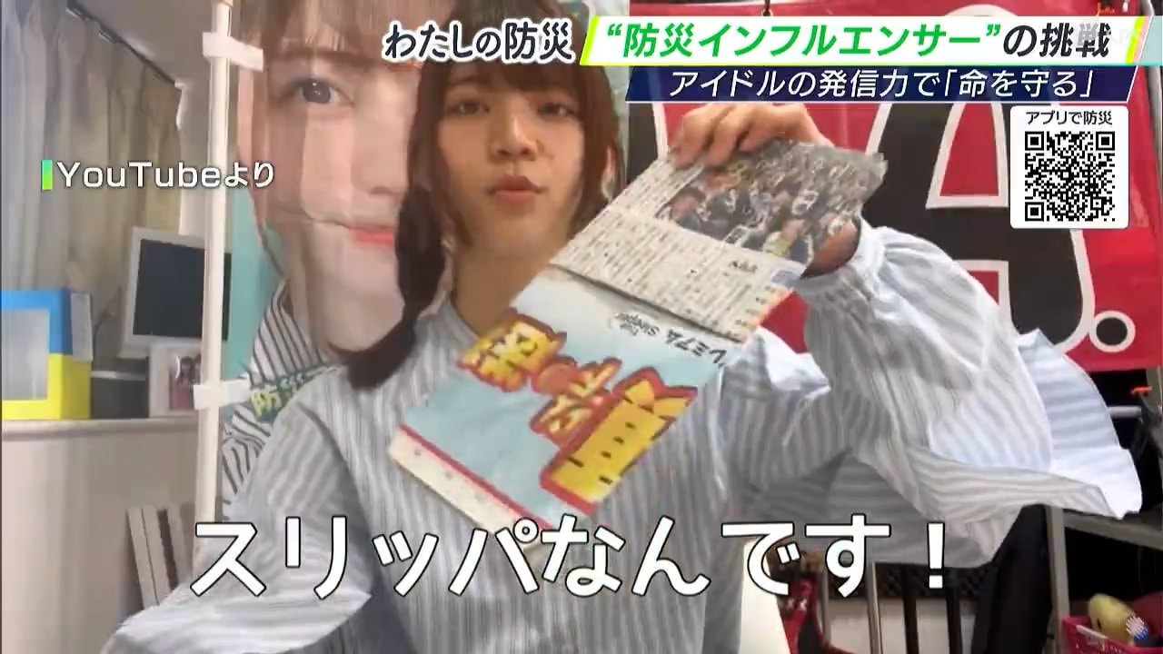 ファンや同世代の命を守るために切り開いたのは防災アイドルという新ジャンル。主な舞台は、動画配信です。新聞紙で作ったスリッパや推し活には欠かせないペンライトとペットボトルを組み合わせたランタン。家庭でもできる手作り防災グッズだけでなく、避難所での過ごし方など、災害時に役に立つ身近な情報を発信します。
