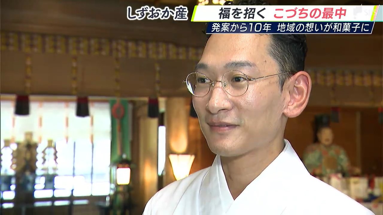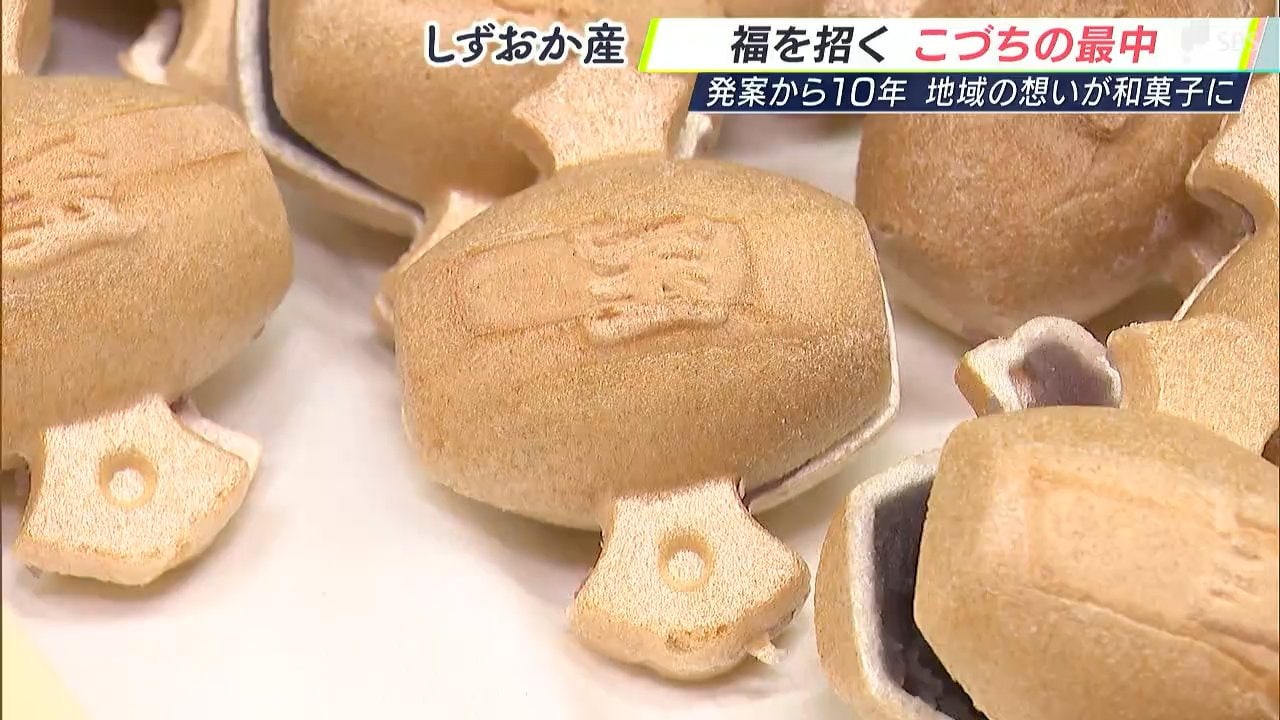 榊原さんは森町議時代の2014年、小國神社にちなんだ新しい名物を作ろうと打ち出の小槌の最中を発案。金型を業者に依頼し、打田宮司や地元の有志とともに、商品化にむけて奔走しました。