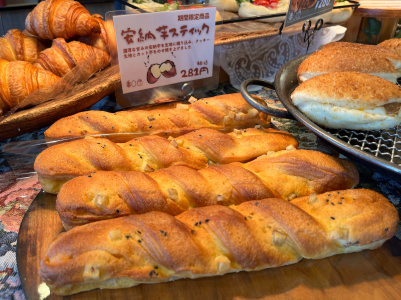 ・安納芋のスティックパン(281円):安納芋の濃厚な甘さと豊かな風味が口いっぱいに広がり、クッキー生地とカットされたお芋が楽しい食感を演出します。