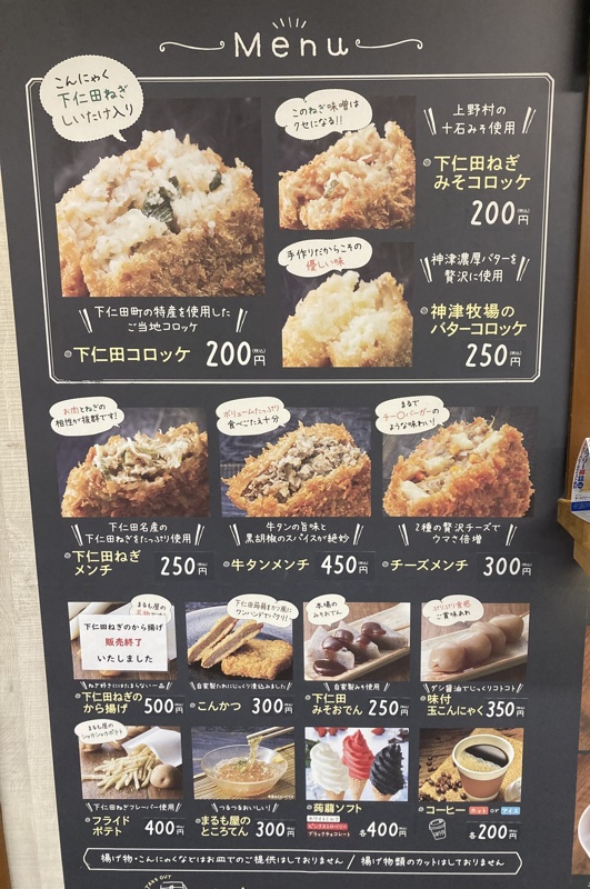 「下仁田」といえば「下仁田ねぎ」が有名ですね。ということで、下仁田ねぎ・しいたけ・蒟蒻が入った「下仁田コロッケ」と、上野村の十石みそを使用した「下仁田ねぎみそコロッケ」などを購入。ホクホク熱々でどれもおいしい!また、「下仁田ねぎも」という旨ダレをお土産に購入しました。家にある調味料と混ぜるだけで、簡単においしいタレができるという商品です。マヨネーズと混ぜてタルタルにしたら最高でした!
