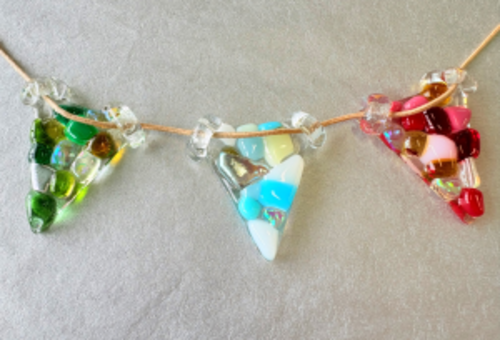 色や形が様々なガラスを組み合わせ、熱を加えて溶かし合わせるフュージングでアクセサリーを作ってみませんか?12月は色とりどりのガラスを使ってオリジナルのガーランド(三角旗の飾り)をお作りいただけます。