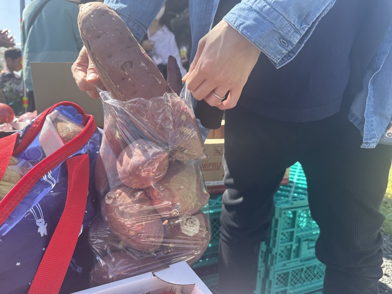 取材に訪れた日の目玉は、数量限定「紅はるか詰め放題」が300円!ビニル袋からはみ出してもいいので、コレくらい入れてください。