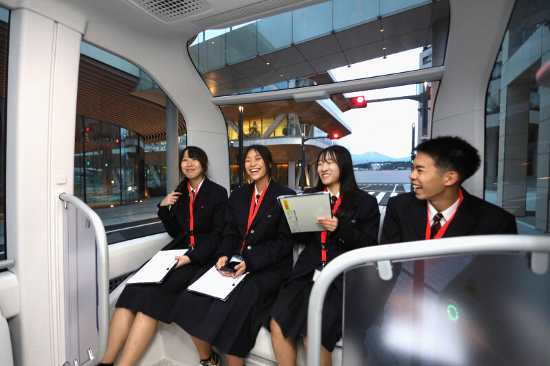 高校生が最も楽しみにしていた一つに、トヨタが開発しているさまざまなサービスに活用できる電気自動車「e-Palette(イーパレット)」への試乗がありました。近づいてきたイーパレットに、「かわいい」と大喜びの生徒たち。箱型の大きなボディが近代的でどこか親しみやすく、エリア内を時速15キロで走ります。内部は一つの部屋のようで、「快適な乗り心地」「窓が広くて開放的」「振動が少ないから酔わなそう」と高校生は興奮気味でした。