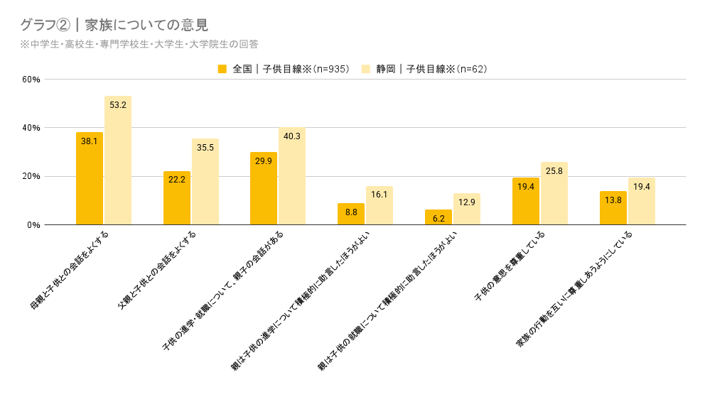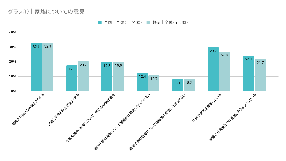 まずグラフ①は全国調査全体と静岡全体で「家族について」の意見を比較したものです。