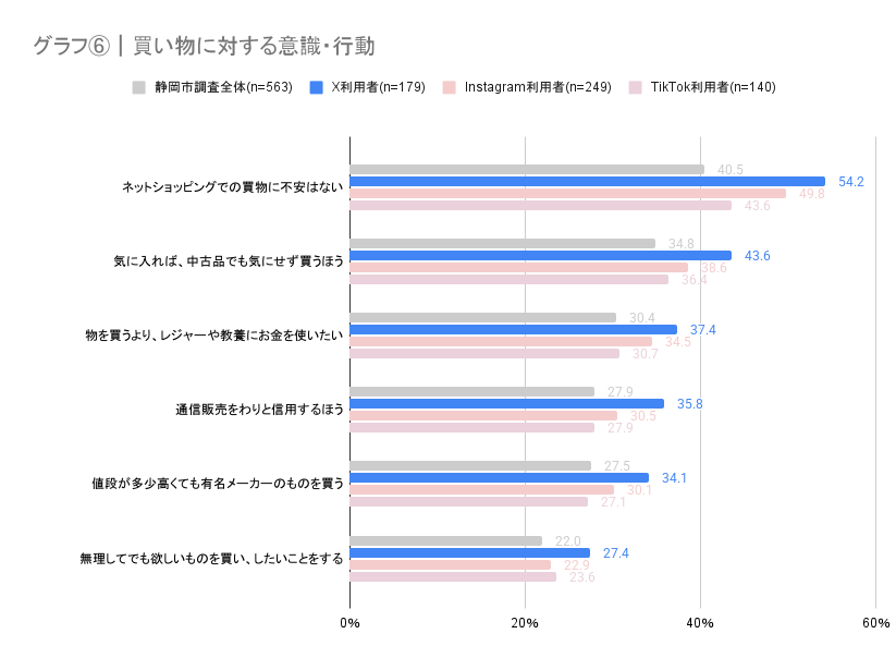 Xユーザーは、「ネットショッピングに不安はない」「通信販売を信用するほう」と回答した人が他のSNSよりも多く、これはオンライン購入への心理的な障壁が極めて低いことを示しています。