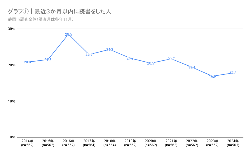 グラフ①を見ると、この10年の間で3か月以内に読書をした人の割合は減少傾向にあることがわかります。最も読書をした人が多かった2016年の28.5%と比べると、2024年は17.8%で10ポイント以上の差が生じています。